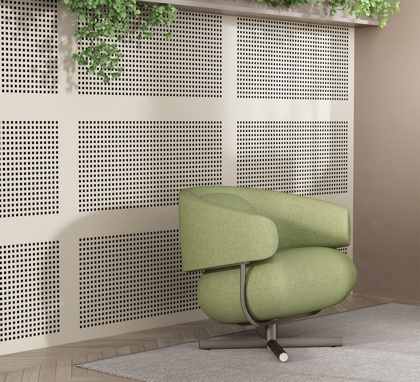 Плиты перфорированные гипсокартонные звукопоглощающие (ППГЗ), перфорация «Квадро Блочная». Смонтированные на каркасе, являются эффективными звукопоглощающими конструкциями резонансного типа. Существенное значение для величины низкочастотного звукопоглощения имеет величина относа плит от жесткой поверхности. Увеличение звукопоглощающих свойств в более широком частотном диапазоне обеспечивается дополнительным размещением плит типа Шуманет во внутреннем пространстве между жесткой поверхностью и облицовкой.