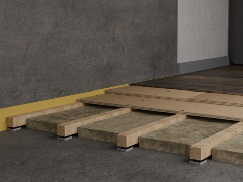 Звукоизоляционный пол по лагам с применением регулируемых виброизолирующих опор Виброфлекс LD (шаг 400 мм)