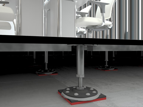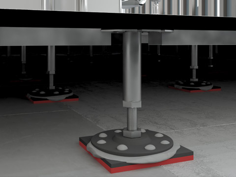 Виброизолирующие опоры ВИБРОФЛЕКС ФП-160 укладываются на выровненное основание без дополнительной фиксации к нему упругим материалом вниз. Стойка фальшпола приклеивается к распределительной пластине